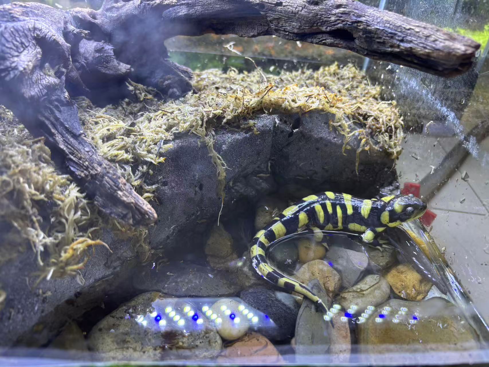 然而,为了让虎皮蝾螈的生活更加丰富多彩,也为了日后的繁殖工作能够更加顺利,饲养员决定对饲养缸进行重新设计。这次,饲养缸里大部分区域都被布置成了陆地,在后方还种植了一些植物,既美化了环境,又增添了几分自然气息。底材选用无菌土,上面还盖了一层水苔,既保证了环境的卫生,又营造出了适宜虎皮蝾螈生活的湿度。一个躲避穴被巧妙地放置其中,为蝾螈提供了一个安静的避风港。而在右前方,他们圈出了一块小水池,池边铺上了石头,既方便蝾螈进出水池,又增添了自然的美感。