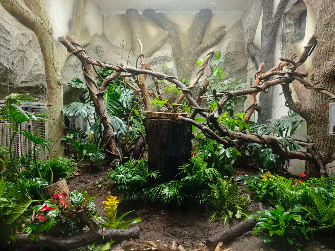 针对小食蚁兽半树栖、喜隐蔽的特点,展区内新增了天堂鸟、棕竹等阔叶植物,搭配原有栖架,形成高低错落的植被层次,既满足其攀爬、刨土的行为需求,又提供了安全的隐蔽空间;领狐猴展区则补种了散尾葵、绿萝等热带植物,与粗壮的栖木相互映衬,还原了马达加斯加雨林的植被风貌,激发其跳跃、觅食的自然行为。